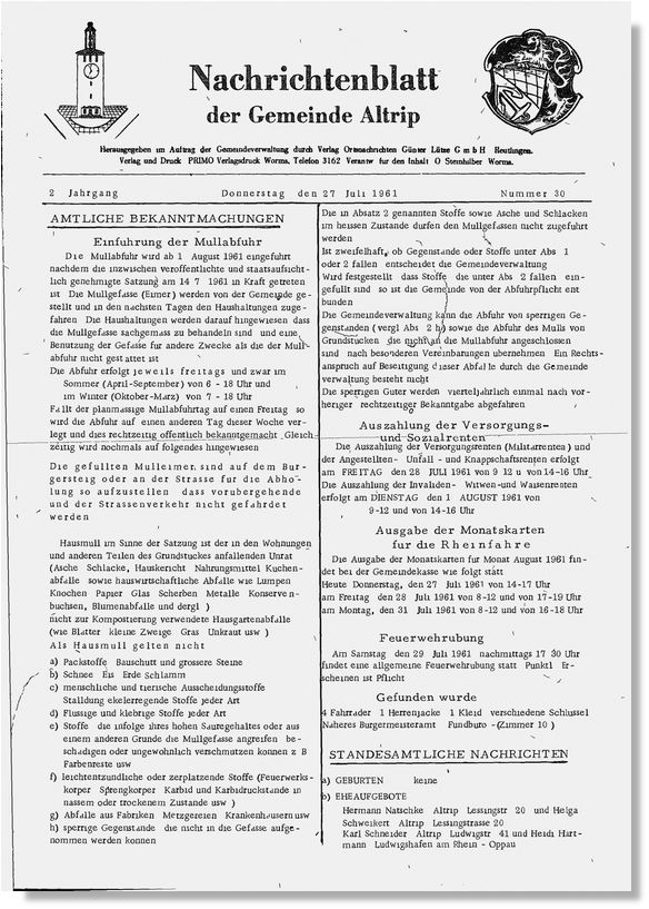 Die AMTLICHE BEKANNTMACHUNG im Nachrichtenblatt der Gemeinde Altrip (2. Jahrgang, Nummer 30) vom Donnerstag, 27. Juli 1961, lautete wie folgt: