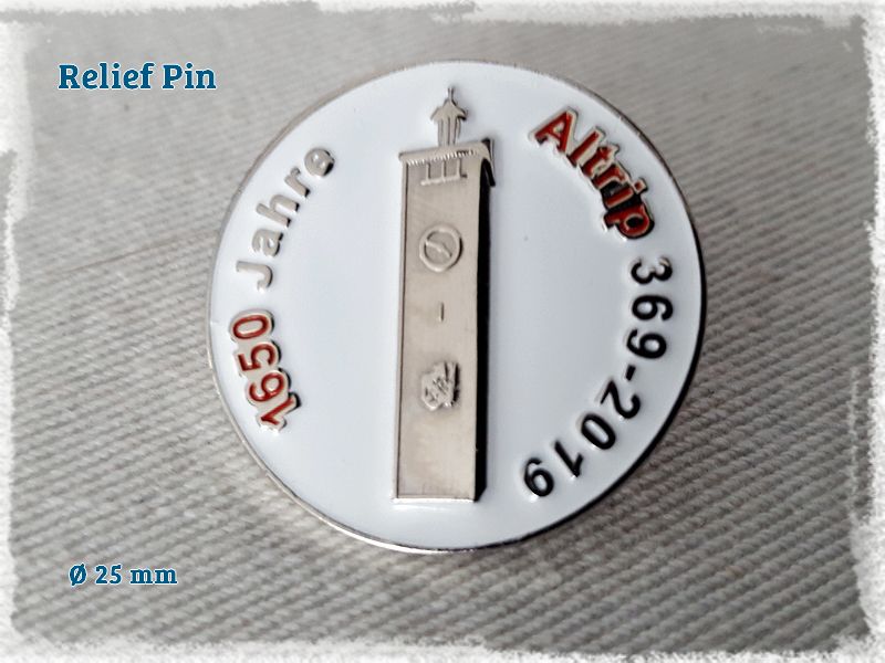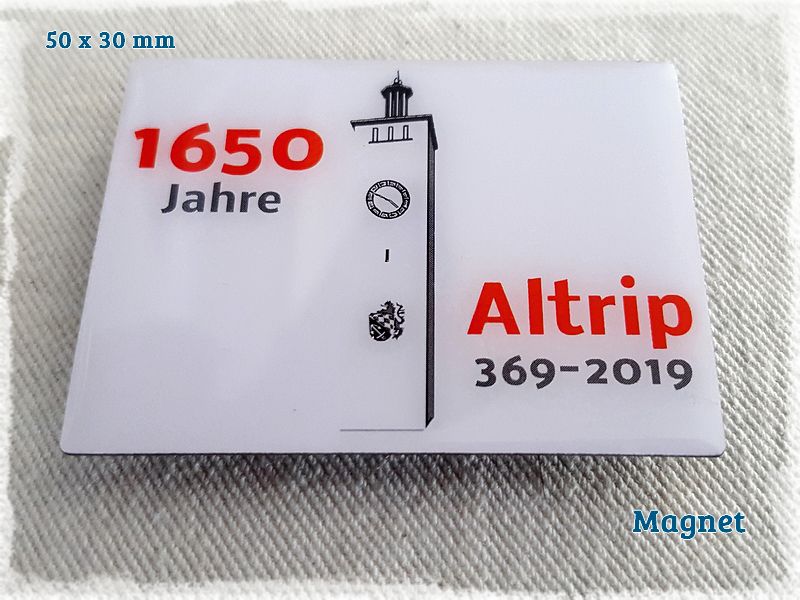 Natürlich sind diese Feierlichkeiten auch mit Kosten verbunden. Auch hier gehen wir in Altrip neue Wege: Für nur 10,- Euro wird man Sponsor des Festjahres und kann damit seine Verbundenheit zu Altrip und der bevorstehenden 1650-Jahr-Feier zeigen. Für die Unterstützung gibt es auch ein Dankeschön, ein sichtbares Zeichen „ALTRIP FEIERT 2019 – Ich bin Sponsor“, in Form eines Schlüsselanhängers, eines Kühlschrankmagneten, eines Reliefpin oder eines bedruckten T-Shirts.