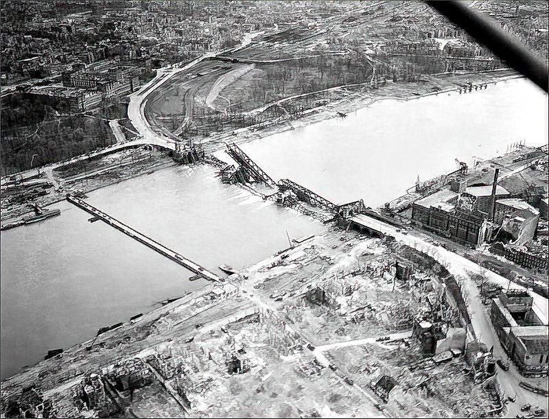 Zerstörung im Großraum Ludwigshafen-Mannheim, die Aufnahme aus dem Jahr 1945 (Ende März / Anfang April) zeigt die gesprengte alte Rheinbrücke, links oben ist das Mannheimer Schloss und am rechten Bildrand die Ludwigshafener Walzmühle zu erkennen, ansonsten … | Foto: Wikimedia CommonsIm Jahr 1944 lebten die Menschen im Großraum Mannheim-Ludwigshafen in ständiger Angst vor dem zunehmenden Bombenhagel alliierter Luftverbände, im damaligen Sprachgebrauch auch „Terrorangriffe” genannt. Luftalarm gab es nahezu täglich, manchmal auch mehrmals am Tag. Bis zur Entwarnung konnten oft Stunden vergehen und so lange saßen viele Menschen zitternd oder stumm in Bunker und behelfsmäßig umgebauten Luftschutzkellern. Zu diesem Szenario gesellten sich in der Rheinniederung noch eine weitere Gefahr: Hochwasser.