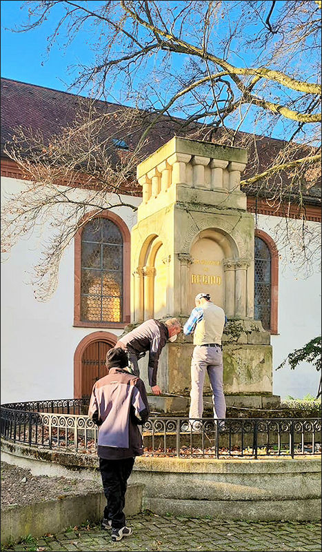 Am Montag, dem 29. März 2021, wurde mit dem ersten Schritt zur Reinigung des Regino-Denkmals begonnen. Dabei entfernte man zunächst in sorgfältiger Handarbeit gröbere Verschmutzungen von der Oberfläche des Denkmals. Zu diesen Ablagerungen gehörten unter anderem Moos und ähnliche Bewuchsformen, die sich im Laufe der Zeit auf dem Stein angesiedelt hatten. Ziel dieser ersten Maßnahme war es, die Oberfläche von locker sitzendem Schmutz zu befreien und damit die Grundlage für die weiteren Reinigungsarbeiten zu schaffen.