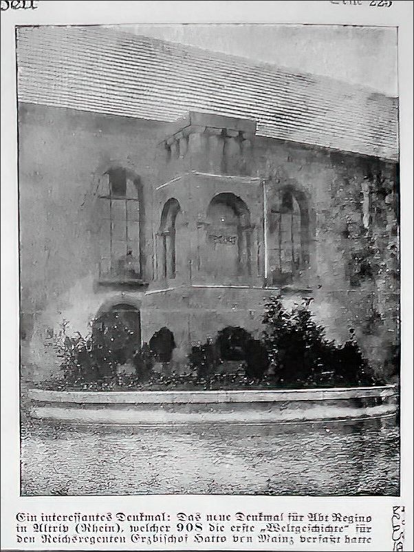 Das Bild trägt die Beschriftung „Ein interessantes Denkmal: Das neue Denkmal für Abt Regino in Altrip (Rhein), welcher 908 die erste Weltgeschichte für den Reichsregenten Erzbischof Satto von Mainz verfaßt hatte“.