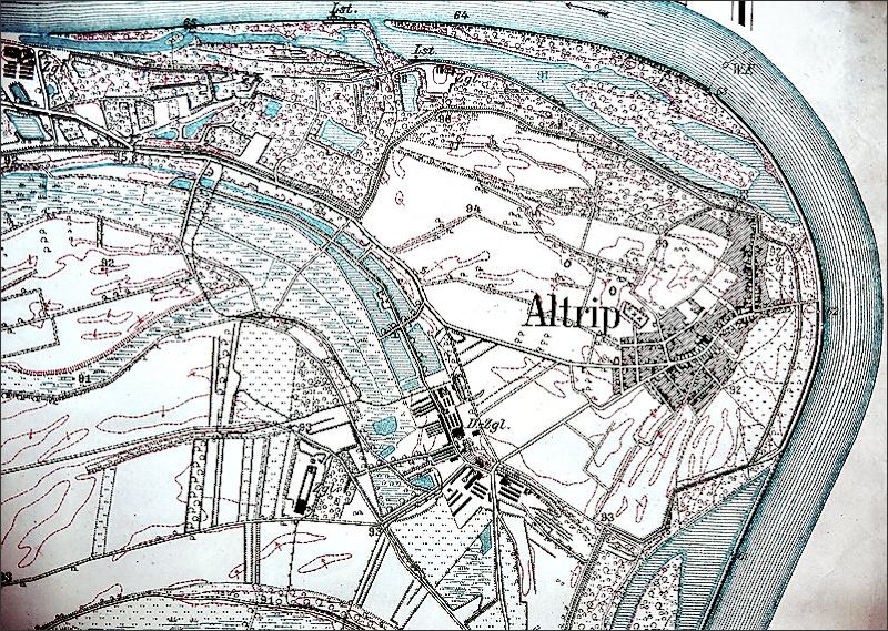 Übersichtskarte aus dem Jahr 1918Anfang Dezember 1918 erschienen die ersten französischen Besatzungstruppen in Altrip und errichteten in der Ludwigsschule eine Ortskommandantur und an der Fähre eine Grenzkontrollstation.
