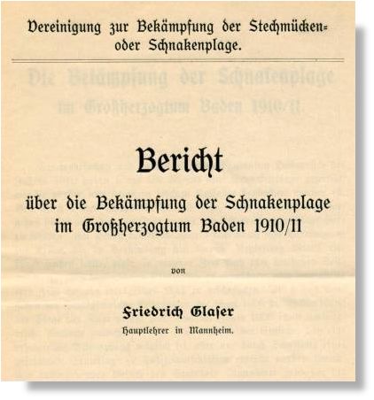 Juckende Quaddeln von Schnakenstichen machten aber auch schon dem Freiherr Böcklin von Böcklinsau aus dem badischen Rust ordentlich zu schaffen. Sein Verdienst ist es, dass er bereits 1910 ein “Aktionskomitee zur Bekämpfung der Schnakenplage“ in Karlsruhe gründete, an dem sich kommunale Vertreter der gesamten badischen Rheinschiene von Mannheim bis Freiburg beteiligten. Auch Ministerialräte der badischen Regierung und ein Medizinalrat aus Straßburg nahmen bereits an der ersten Sitzung des Komitees teil. Vorsitzender war damals Kammerherr Baron Böcklin und als Sitz der Geschäftsführung wurde 1910 Karlsruhe bestimmt. Schon kurze Zeit später übernahm der Hauptlehrer Friedrich Glaser die Geschäftsführung in Mannheim.