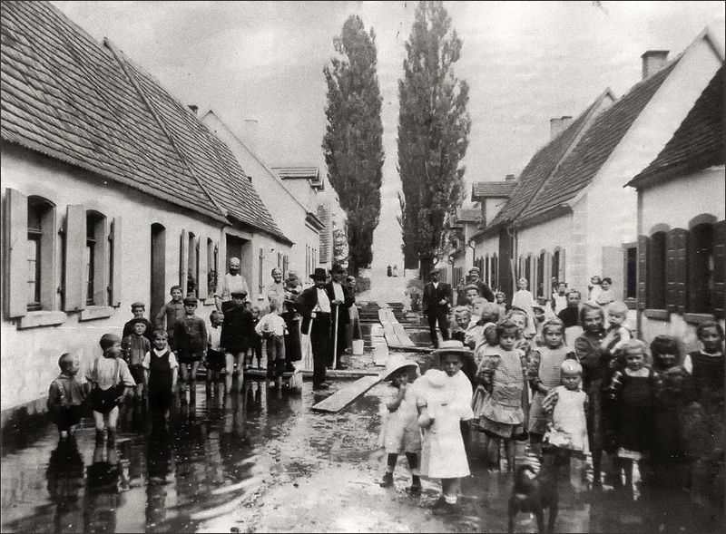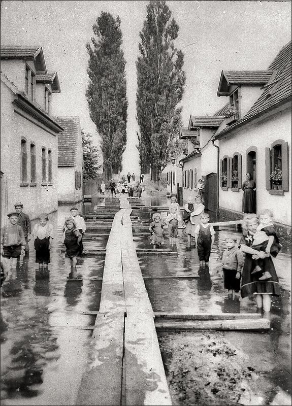 Das Hochwasser 1910 in Altrip – Aufnahme in der RheinstraßeDer Damm war an zwei Stellen gebrochen. Häuserwände stürzten ein und in den Scheunen verendete das Vieh. Auch das gerettete Vieh kam jämmerlich um, denn die Flut hatte das Futter weggeschwemmt oder verdorben. Und schlimmer noch: Der reißende Strom hatte die Fische aus Teichen und Tümpeln hinweg gerissen, die Altriper somit ihrer Nahrungsquellen entblößt.