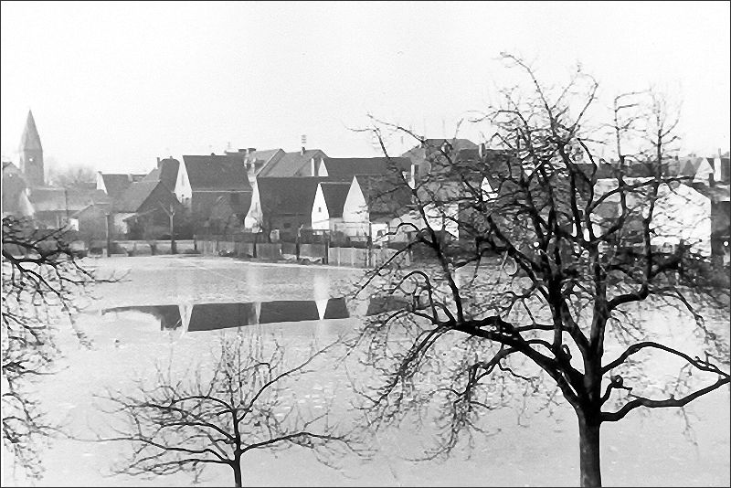Das Hochwasser 1954 in Altrip – Aufnahme vom 20. Januar, die Gärten der Rheinstraße in Richtung SportplatzNach dem Hochwasser des Jahres 1926 gingen die Altriper, was öffentliche Hilfen betrifft, wiederum nahezu leer aus. Und wieder schöpften die Altriper Hoffnung auf eine gesetzliche Hochwasser-Versicherung mit erträglichen Beiträgen und Selbstbehalten nachdem in Baden-Württemberg 1960 eine obligatorische Versicherung gegen Hochwasserschäden eingeführt wurde.