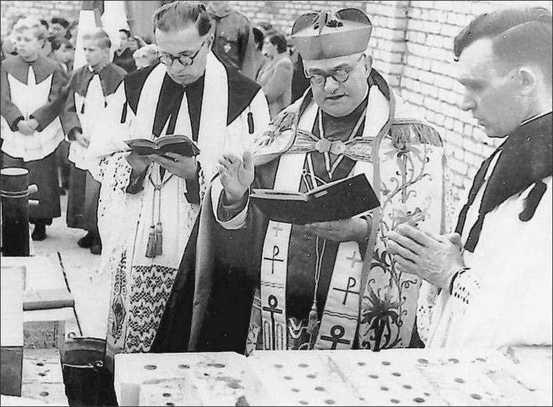Domkapitular Alfred Scheller (vorne Mitte) legte mit Pfarrer Gottfried Knecht den Grundstein.