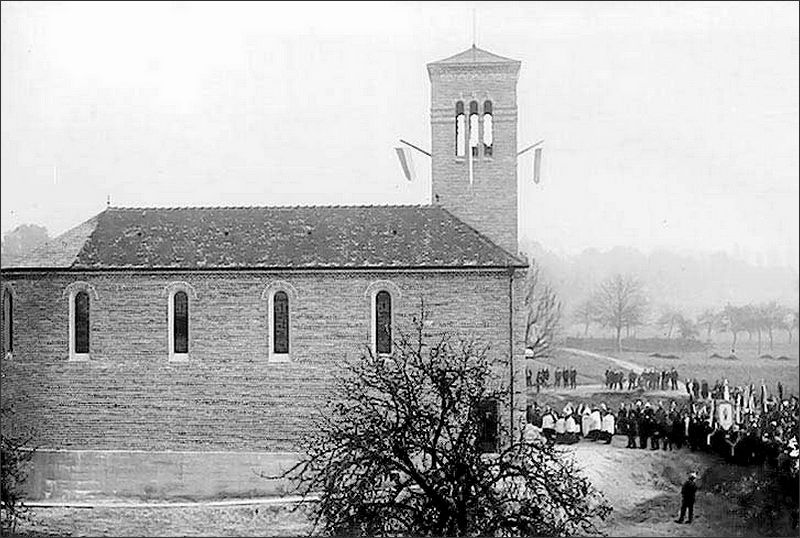 Mit Hilfe eines Kirchenbau-Sammelvereins wurde am 18. Oktober 1931 für die rund 280 Katholiken eine eigene Kirche – erbaut zu Ehren der Apostelfürsten Petrus und Paulus und des zweiten Patrons Sankt Petrus Canisius – eingeweiht. Doch schon zwölf Jahre später wurde das Gotteshaus bei einem Fliegerangriff völlig zerstört.